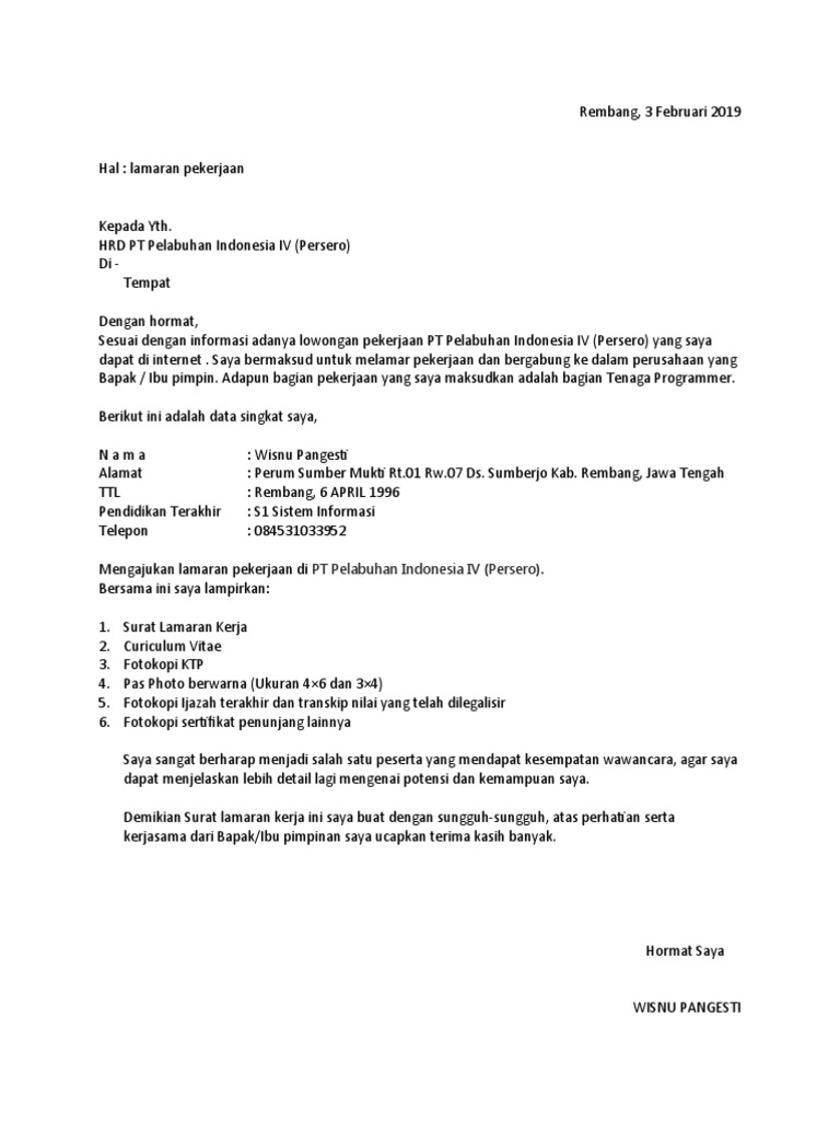 Contoh Surat Lamaran Pt Pelabuhan Indonesia Iv Persero Pdf
